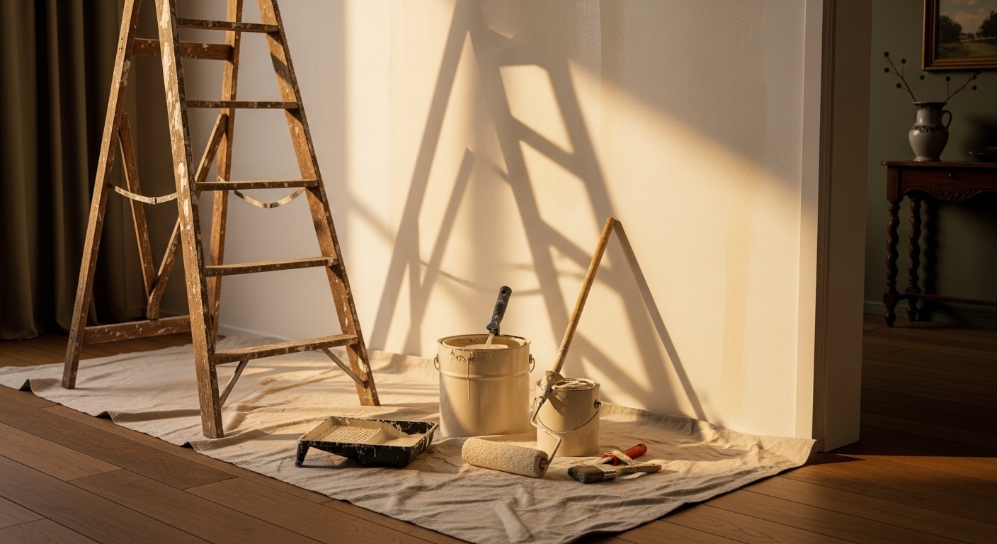 - Foto's van je werkplaats of opslagruimte met netjes uitgestalde verfblikken en gereedschap